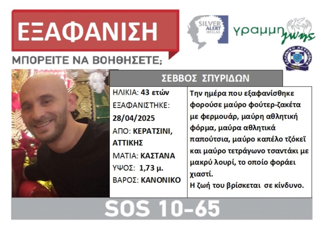 Όποιος γνωρίζει κάτι, παρακαλείται να επικοινωνήσει με την υπηρεσία Silver Alert, όλο το 24ωρο, στην Εθνική Γραμμή SOS 1065, το «Τούνελ» ή τις Αρχές.