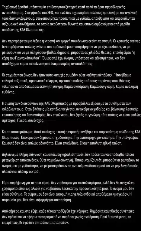 «Τη χθεσινή βραδιά υπέστην μία επίθεση που ξεπερνά κατά πολύ τα όρια της αθλητικής αντιπαλότητας. Στο γήπεδο του ΣΕΦ, και ενώ δεν είχα καμία απολύτως εμπλοκή με τον αγώνα ή τους διαγωνιζόμενους, στοχοποιήθηκα προσωπικά με χυδαία, απάνθρωπα και απροκάλυπτα σεξιστικά συνθήματα, τα οποία ακούστηκαν δυνατά και επαναλαμβανόμενα από μερίδα οπαδών της ΚΑΕ Ολυμπιακός.
