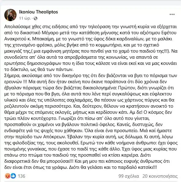 «Απολαύσαμε χθες στις ειδήσεις από την τηλεόραση την γνωστή κυρία να εξέρχεται από το δικαστικό Μέγαρο μετά την κατάθεση μήνυσης κατά του αξιότιμου Εφέτου Ανακριτού κ. Μπακαίμη, με το γνωστό της ύφος δέκα καρδιναλίων, με το μαλάκι της χτενισμένο φρέσκο, μόλις βγήκε από το κομμωτήριο, και με το σχετικό μακιγιάζ της,( μια εμφάνιση μητέρας που πενθεί για το χαμό του παιδιού της!!!). Να συνοδεύετε απ’ όλα αυτά τα απροβράσματα της κοινωνίας, να απαντά σε ερωτήσεις δημοσιογράφων που η ίδια τους κάλεσε να είναι εκεί και να μας κουνάει το δάκτυλο, ως θεά των πάντων.