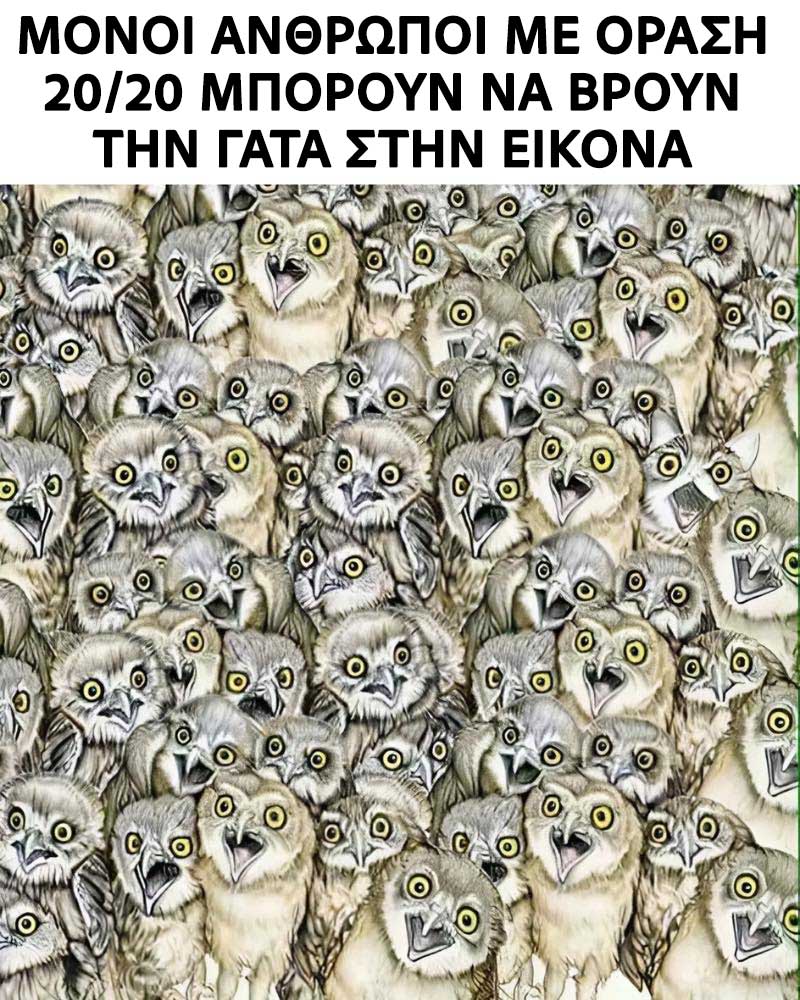 Με την πρώτη ματιά, η εικόνα φαίνεται να δείχνει μια συλλογή από κουκουβάγιες. Όμως υπάρχει μια ανατροπή: μια γάτα είναι έξυπνα κρυμμένη κάπου μέσα στην εικόνα. Μπορείτε να τη βρείτε;