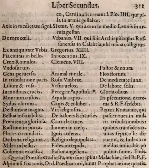 Ωστόσο, υπάρχει ένα βιβλίο γνωστό ως «Η Προφητεία των Παπών», το οποίο φέρεται να γράφτηκε το 1100 από έναν Ιρλανδό ονόματι Saint Malachy, ή απλά Malachy για τους φίλους του, καθώς ανακηρύχθηκε άγιος αρκετές δεκαετίες μετά το θάνατό του.