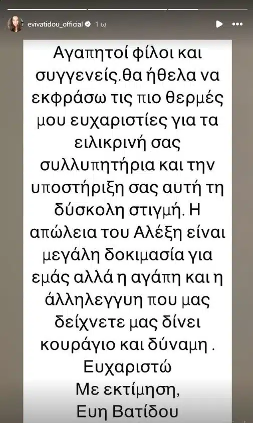 «Αγαπητοί φίλοι και συγγενείς, Θα ήθελα να εκφράσω τις πιο θερμές μου ευχαριστίες για τα ειλικρινή σας συλλυπητήρια και την υποστήριξή σας. Η απώλεια του Αλέξη είναι μεγάλη δοκιμασία για εμάς, αλλά η αγάπη και η αλληλεγγύη που μας δείχνετε μάς δίνει κουράγιο και δύναμη. Ευχαριστώ. Με εκτίμηση, Εύη Βατίδου», έγραψε χαρακτηριστικά.